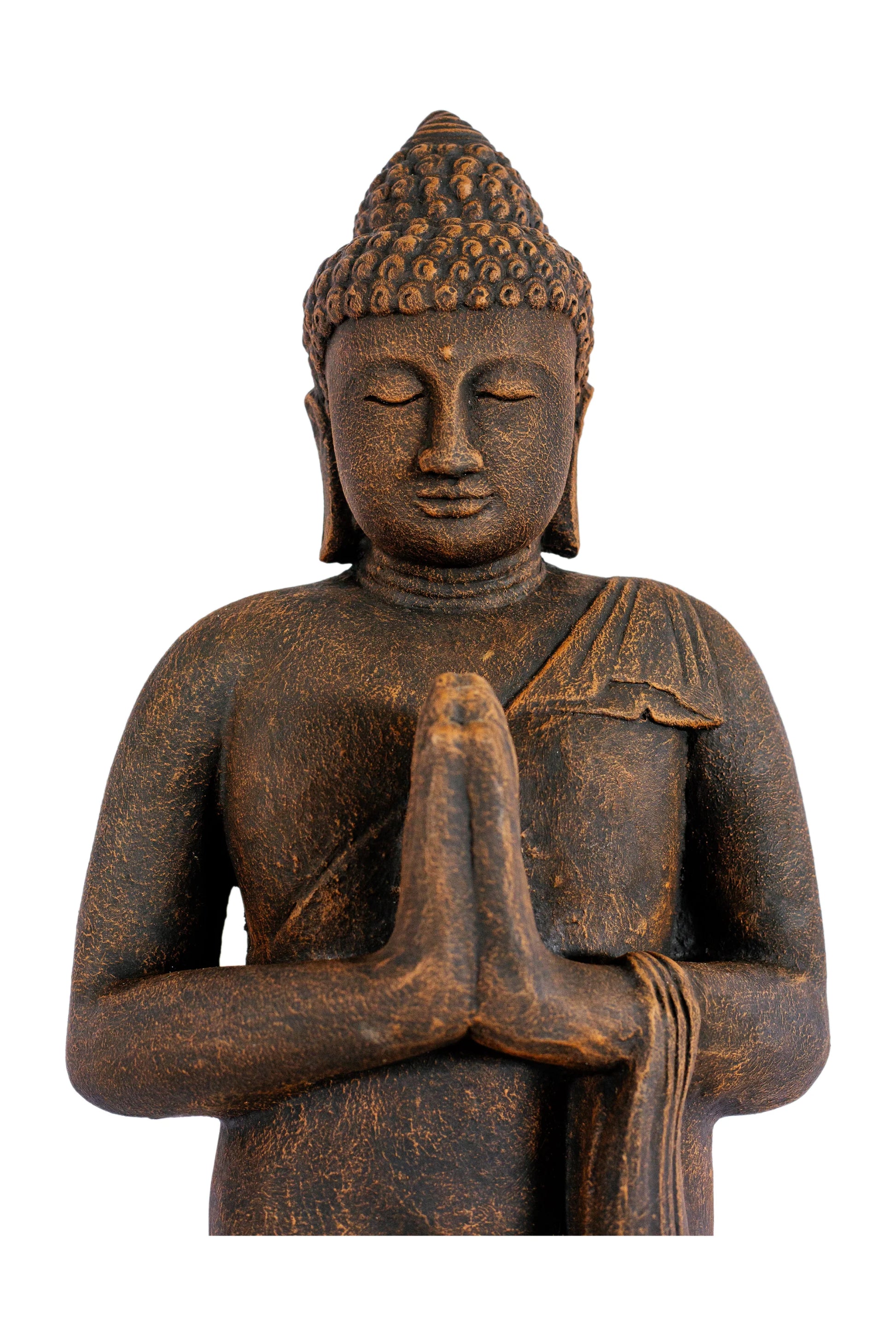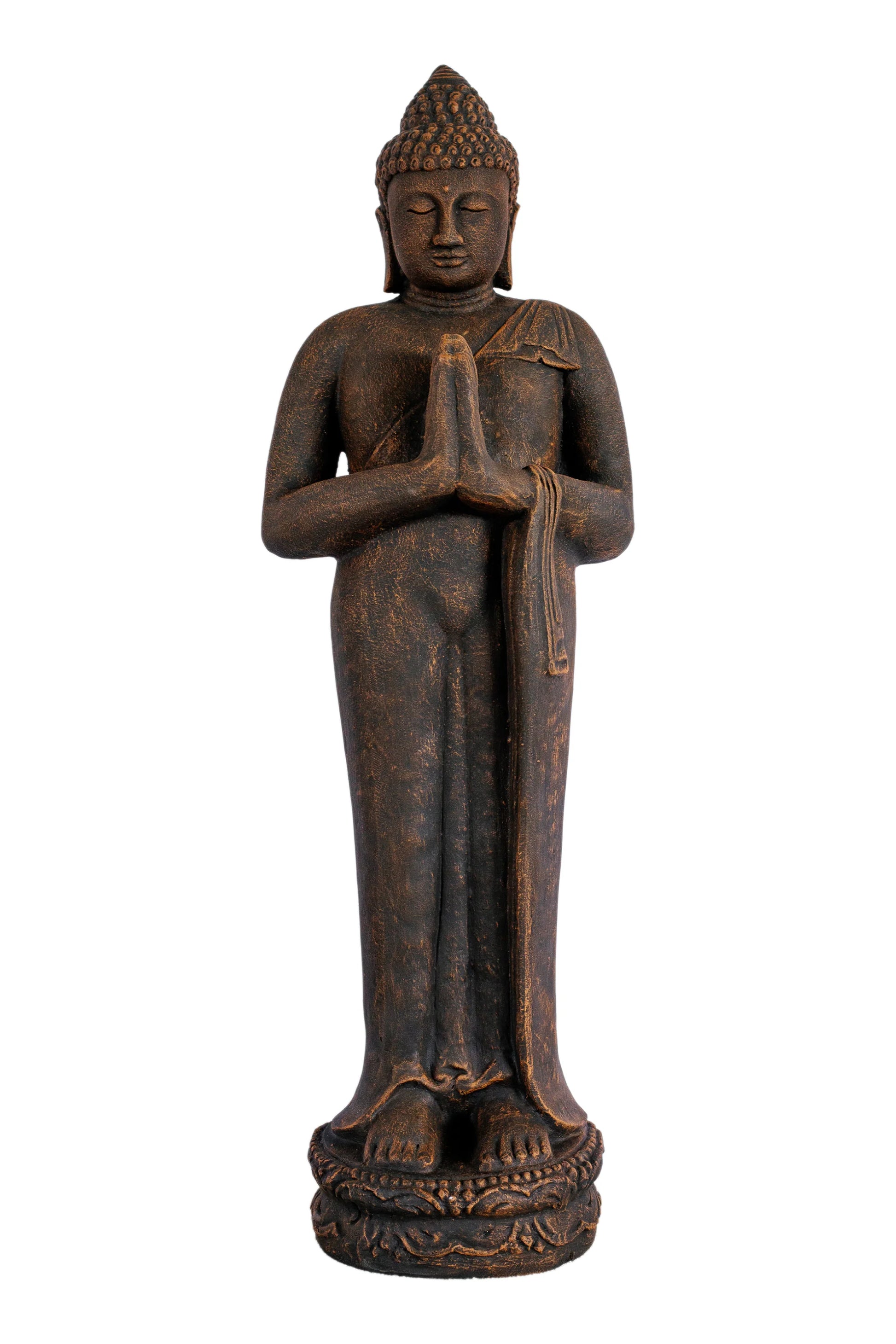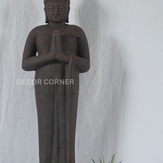 This Standing Buddha statue features an antique bronze finish that adds warmth and serenity to indoor spaces. Its calm posture makes it suitable for living areas, meditation corners, or prayer rooms.