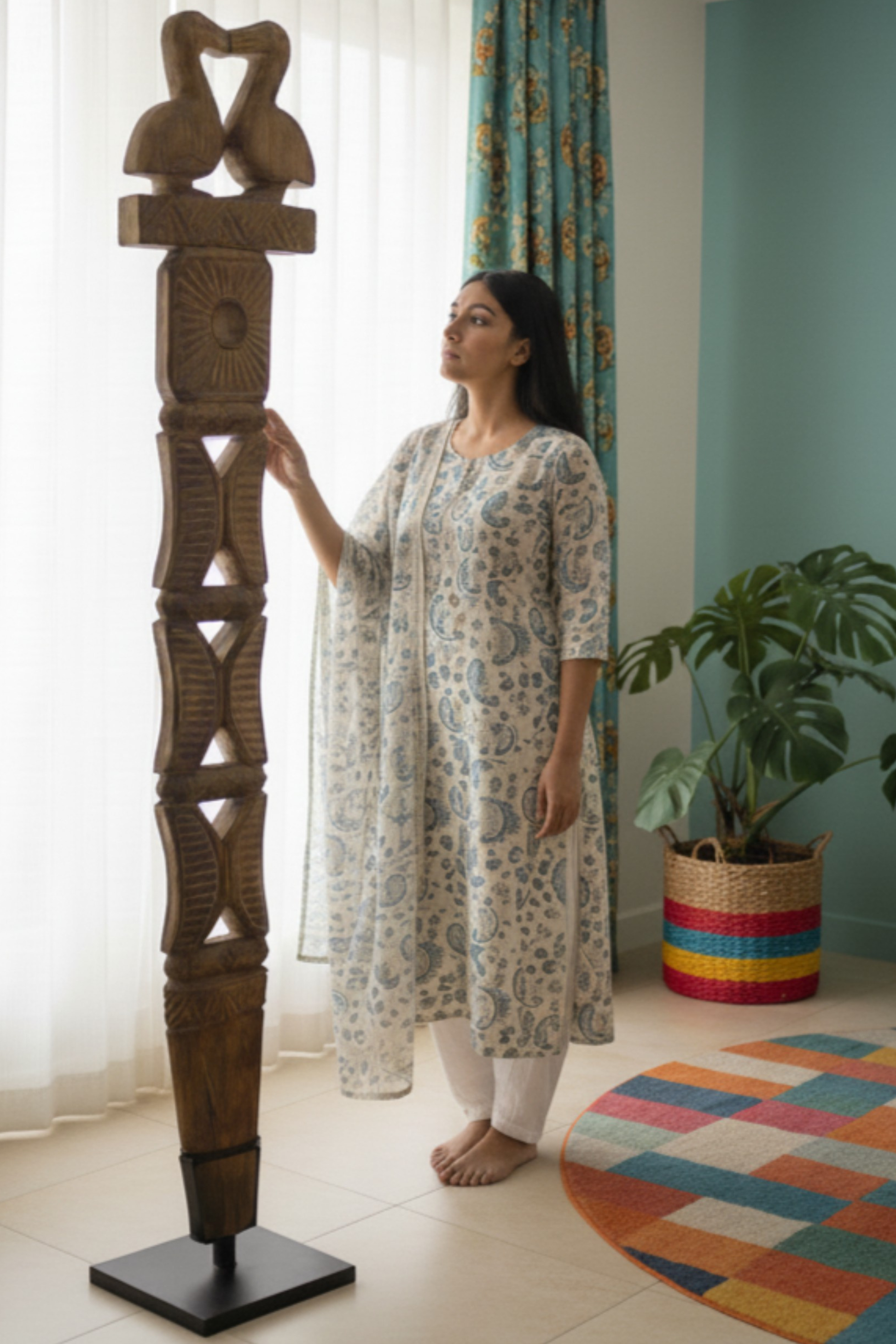 Inspired by royal authority, this wooden scepter-style decor stands tall and commands attention. Ideal for floor placement in spacious indoor environments.