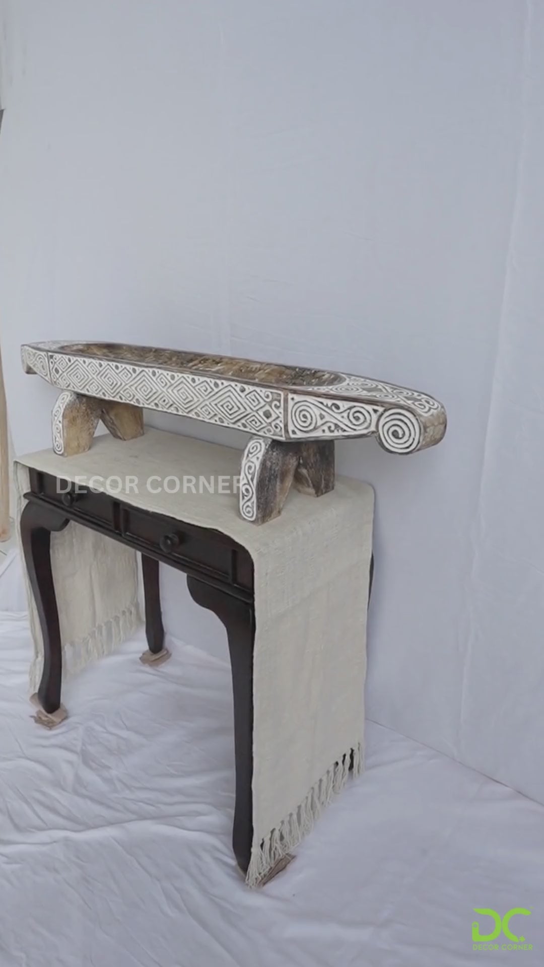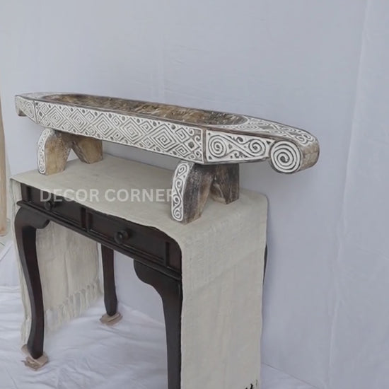 Inspired by traditional boat forms, this long sculptural piece works beautifully on consoles, sideboards, and cultural display spaces.